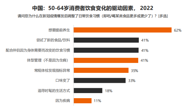健康是老年消費(fèi)者最為關(guān)注的要點(diǎn)。因此,他們會(huì)根據(jù)自己的健康狀況,積極調(diào)整自己的飲食,來配合自己的養(yǎng)生和保健目標(biāo)。這為老年食品飲料創(chuàng)新帶來最大機(jī)遇。