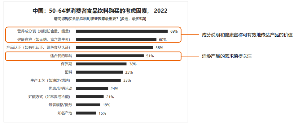 營養(yǎng)成分和健康宣稱是老年消費(fèi)者的普遍訴求,適齡宣稱成為新的機(jī)會(huì)點(diǎn)。