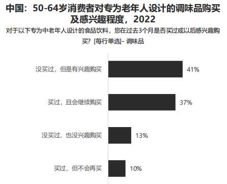 與其他品類相比,老年消費(fèi)者對于醬料和調(diào)味品的沒興趣購買的比例最低,而“沒買過專為老年人設(shè)計(jì)的產(chǎn)品,但是有興趣購買”的比例最高,可以看出這一品類在中老年中有巨大的發(fā)展?jié)摿Α?/span>