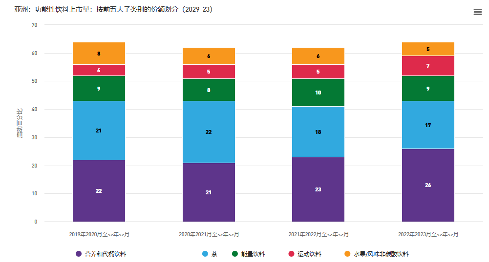 在亞洲推出的功能性飲料中,營(yíng)養(yǎng)和代餐飲料以及運(yùn)動(dòng)飲料推出的份額有所增加。
