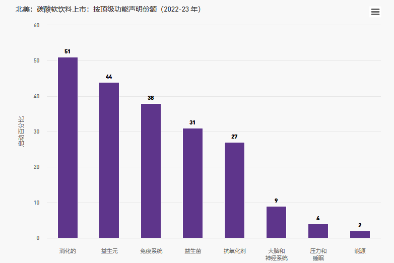 在北美推出的功能性CSD中,消化健康聲明在過去一年中出現(xiàn)在超過一半的介紹中。其中大部分是由Poppi和Rebbl Pop等快速增長(zhǎng)的品牌推出的,這些品牌刺激了益生元,益生菌和消化聲明的軟飲料的增長(zhǎng)。